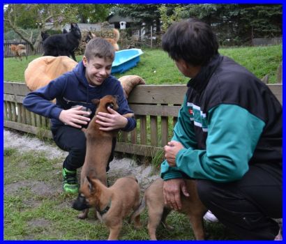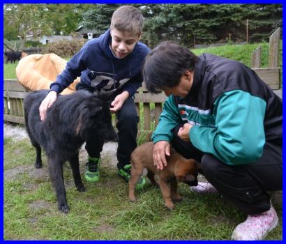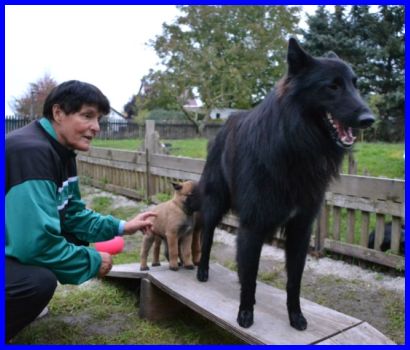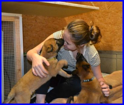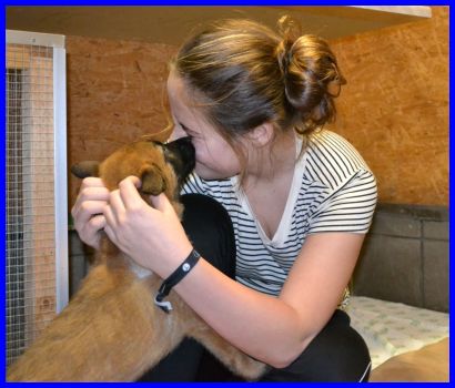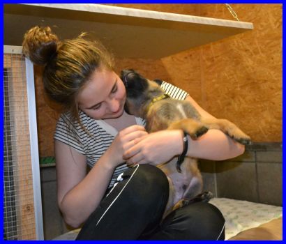 Khenan jr. findet Birgit toll! Auch Akela ist begeistert! Alle Welpen wollten mit Birgit kuscheln und ihre langen blonden Haare kosten :-) |