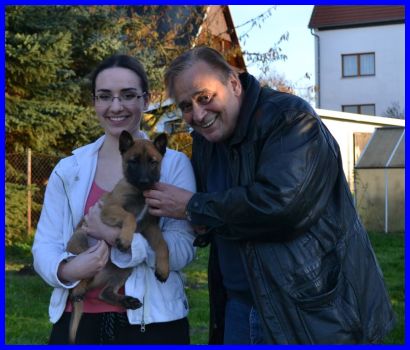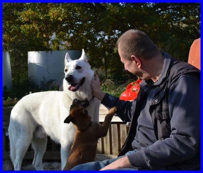 Khenan war der erste Welpe, der in sein neues Zuhause gegangen ist. Er wohnt jetzt in Berlin, hat einen tollen Hundekumpel, Maddox ein weißer Schweizer Schäferhund, und ist sehr glücklich mit seinem neuen Herrchen. Total entspannt liegt er auf dem Arm von Karsten, das war Liebe auf den ersten Blick!