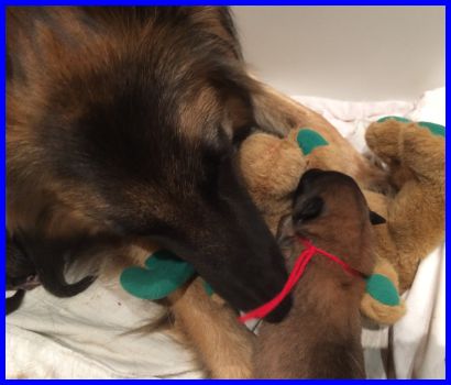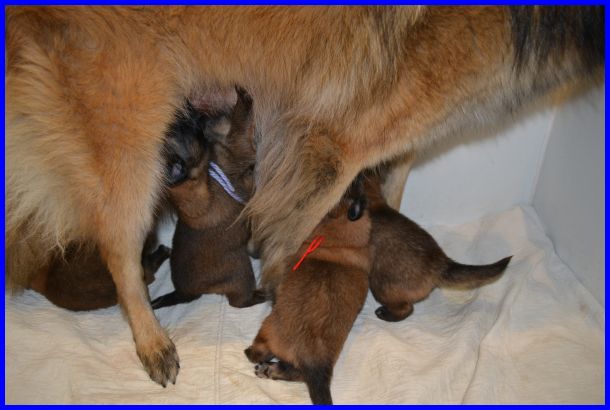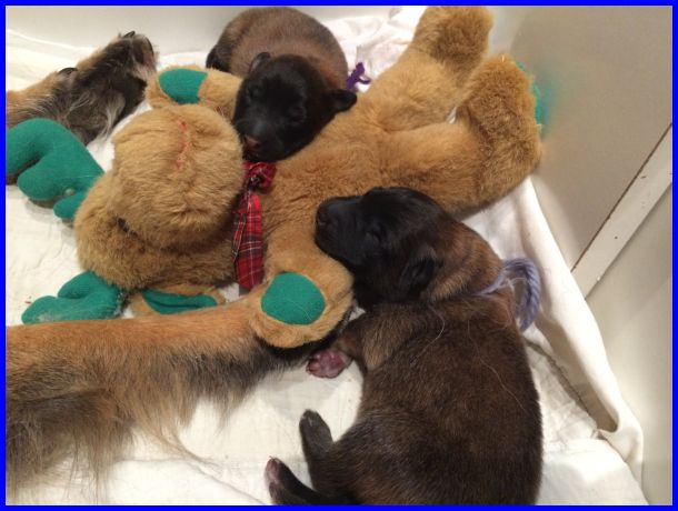 Die ersten Fotos sind vom 14.04.2016 da sind die Welpen erst drei Tage alt! Farouche war der Meinung, ihre Babys brauchen schon ein Plüschtier! Sie hat diesen Weihnachtselch immer wieder zu den Welpen gelegt, so dass ich es dann aufgegeben habe, ihn rauszunehmen!
