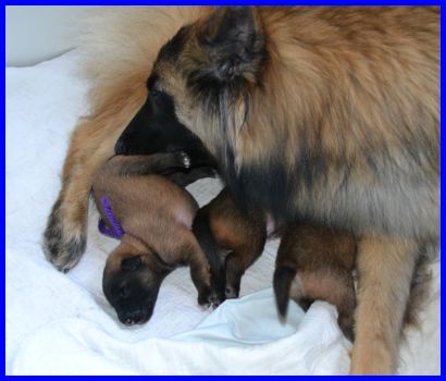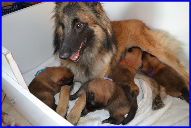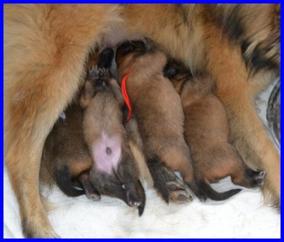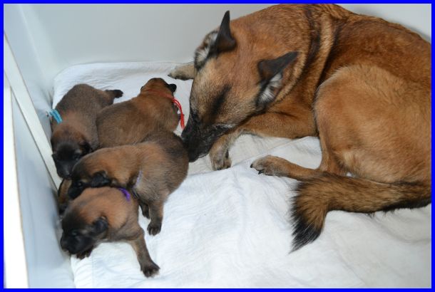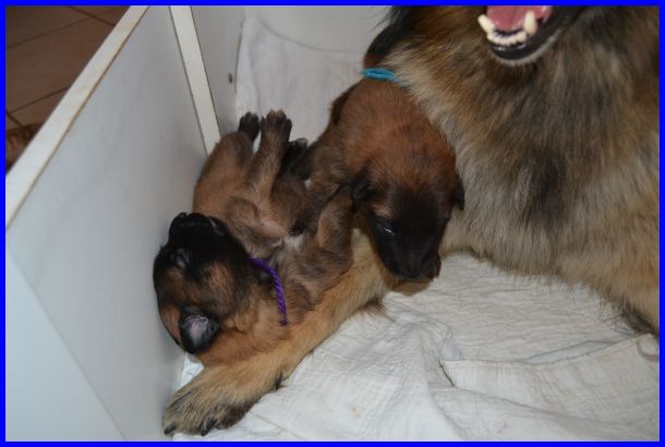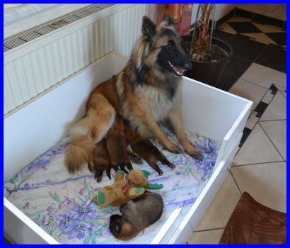 Ich habe Avanti heimlich mal kurz zu den Babys gelassen, Farouche war im Garten! Avanti war so glücklich, hat sich gleich dazu gelegt und die Babys geputzt. Die Welpen sind hier neun Tage alt.