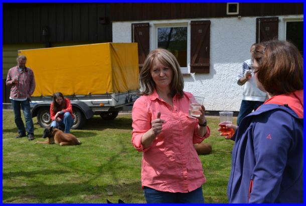 So, jetzt geht´s los! Eine verspätete Begrüßung mit kleiner Ansprache, Isa hat sich erfolgreich gedrückt, danach eine lecker getrocknete Luftröhre für alle Hunde und für die Menschen ein Glas Sekt!