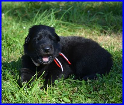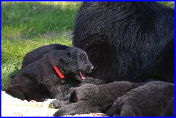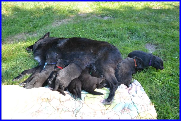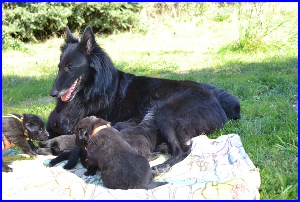Das war alles so aufregend! Nun sind die kleinen Kronjuwelchen erschöpft, satt und träumen im kühlen Schatten vom ersten Abenteuer im Garten. YooPee wacht über ihre Babys, lässt keine anderen Hunde an sie heran kommen.