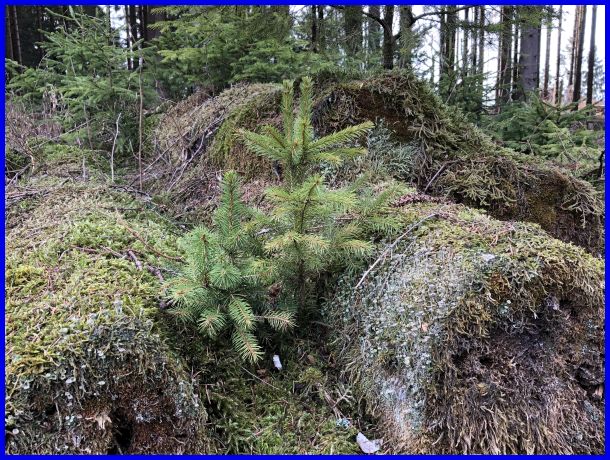 Wunder Natur, auf den verrottenden Bäumen geht das Leben weiter, kleine Bäume wachsen darauf.