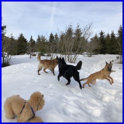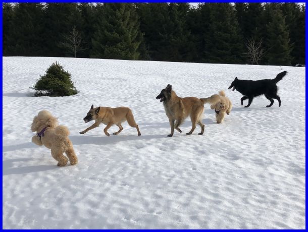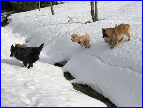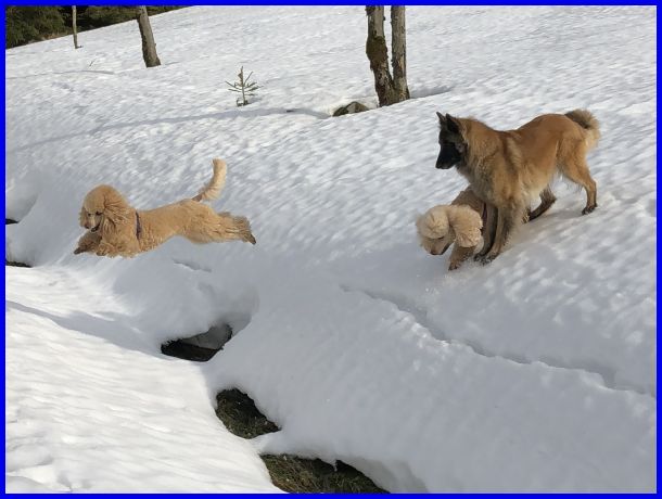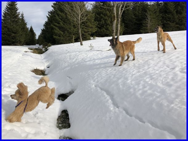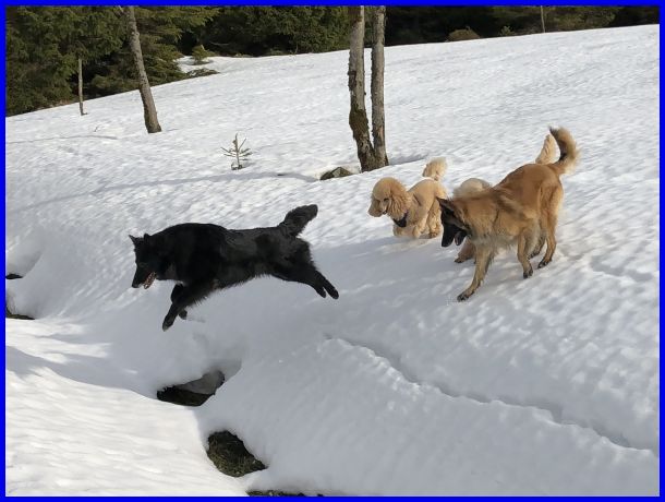 Wow, eine verschneite Wiese und ein kleiner Graben, perfekt für ein Jagdspiel von einer Seite zur anderen! Klar kann man da jede Menge toller Fotos schießen :-)