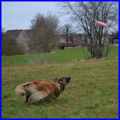 Die nachfolgenden Fotos zeigen Farouche beim Frisbee spielen, das liebt sie besonders! Sie spielt unwahrscheinlich gerne Frisbee, da zeigt sie wie viel Feuer in ihr steckt! Farouche ist enorm schnell und besitzt eine hohe Sprungkraft. Leider habe ich bei uns nicht die Möglichkeit unter professioneller Anleitung mit ihr Frisbee zu trainieren, deshalb spielen wir "just for fun"! Ich habe mit Farouche im Obedience in Klasse 1 mehrere Prüfungen mit Vorzüglich abgelegt. Nun trainieren wir für die Klasse 2! Während der Tragezeit und der Aufzuchtzeit der Welpen ist der Hundeplatz natürlich tabu, deshalb können wir erst im Herbst die nächsten Prüfungen in Angriff nehmen.