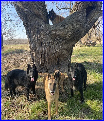 Die nachfolgenden Fotos sind vom13.3.2022 es ist der 45. Tag der Trächtigkeit. Meine Mädels, von links nach rechts: Tervuerendame Farouche, Oma Yoopee, Malidame Akela, die schwangere Viktoria und rechts außen Teenie Mali Quintana