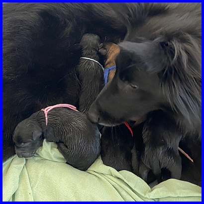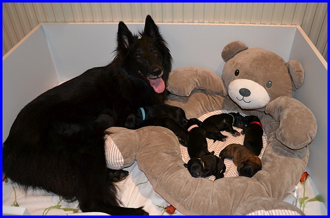 Am 29.03.2022 setzten die Wehen ein und die Geburt meines R-Wurfes begann. In genau vier Stunden und 35 Minuten brachte Viktoria sieben gesunde und putzmuntere Welpen zur Welt. Es war der 61. Tag der Trächtigkeit, die Welpen haben sehr gute Gewichte. Der erste Welpe war ein hübscher Tervueren Rüde, der leider auch der einzige Tervuere geblieben ist. Leider hat uns Vicky kein Tervueren Mädchen geschenkt, sie wäre zu Hause geblieben. Es purzelten dann noch vier Groenendael Rüden und zwei Groenendael Hündinnen in unsere Wurfkiste, somit hat uns Vicky fünf hübsche Prinzen und zwei wunderschöne kleine Prinzessinnen geschenkt. Vicky und den Babys geht es sehr gut, die kleinen "Rohdiamanten" entwickeln sich prächtig, haben schon am ersten Tag zugenommen.