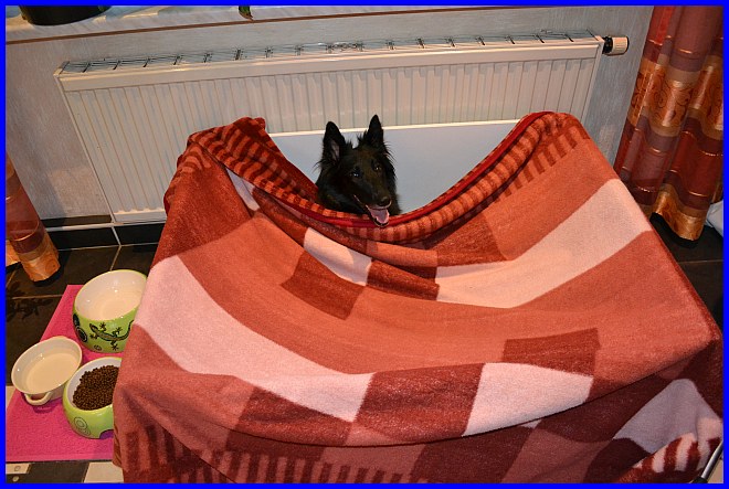 Der erste Welpe, der kleine Tervuere, es ging so plötzlich los, damit hatte ich nicht gerechnet. Vicky hat ihn in ihrem zweiten bevorzugten Wurfplatz, dem Kissen unter der Treppe im Haus, geworfen. Sie hat alles alleine gemacht. Ich war einerseits erschrocken, weil die Geburt schon los ging, andererseits war ich total stolz, sie hat alle Instinkte einer guten Hündin gezeigt!!!