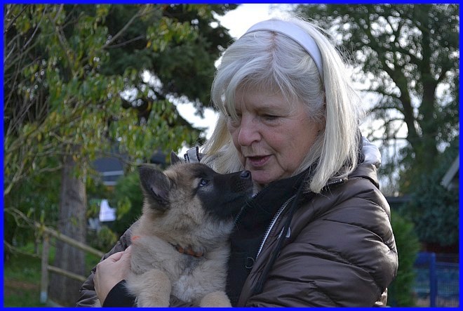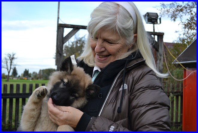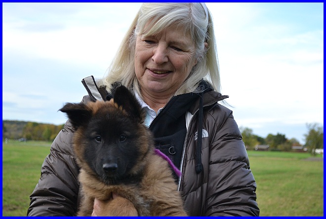Der Welpe, der zuviel Farbe abbekommen hat, der einzige Groenendael in dem Wurf. :-) So eine süße Maus, mega entspannt liegt sie auf Marion ihrem Arm.