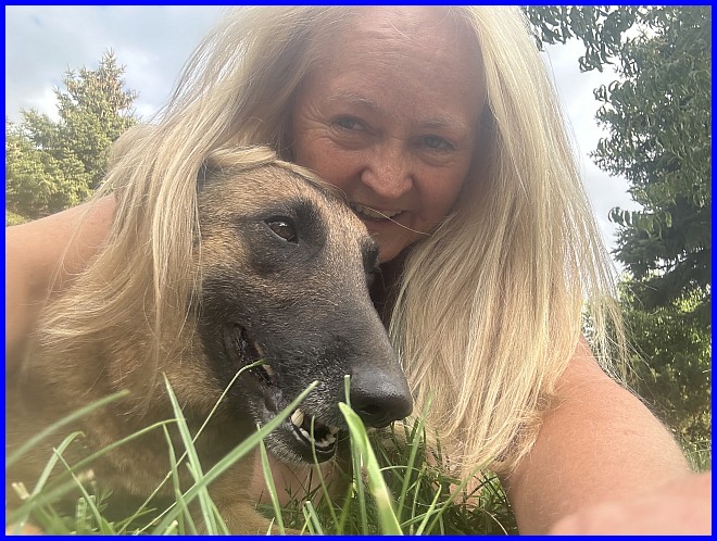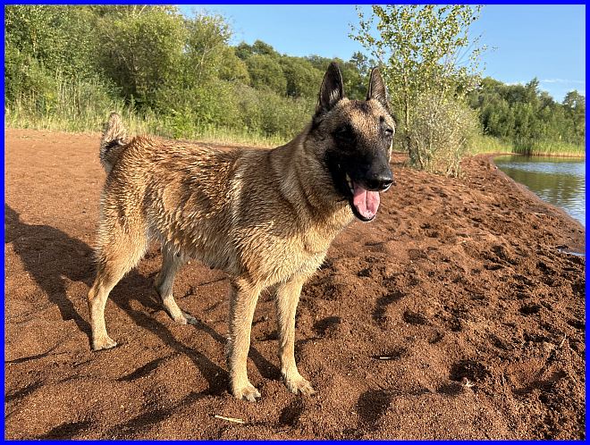 Der 20.08.2024, zwei Tage später waren die Babys da. Es war so unerträglich heiß, aber Schwimmen war nicht möglich, Quintana ließ sich so schlecht ausbremsen und ich wollte kein Risiko eingehen. Also gab es nur einen kleinen Wiesenspaziergang für alle, und Frl. 100000 Volt musste langsam an der Leine laufen.