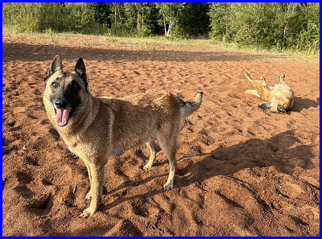 Akela, im Hintergrund, fühlt sich sichtlich wohl, paniert sich gerade mit Sand.