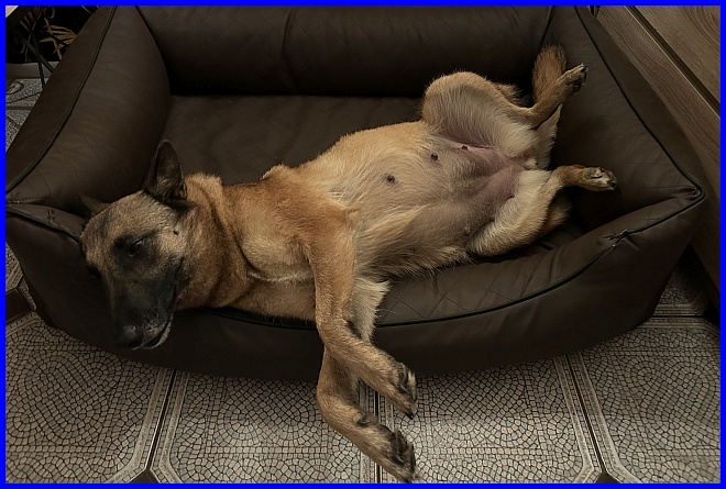 Der 21.08.2024 der 58. Tag und Quintana verschwindet auffällig oft in ihrer Höhle im Garten. Oder sie liegt auf diesem Kissen unter der Treppe, auf dem hat Vicky ihren ersten Welpen zur Welt gebracht. Das ist halt ein guter Höhlenersatz, wenn Frauchen die Garten Höhle nicht erlaubt :-) Das Fell geht auch schon aus, es dauert sicherlich nicht mehr lange, dachte ich. Das Bild ist von 18:30 Uhr, knapp sechs Stunden später war der erste Welpe da!!!