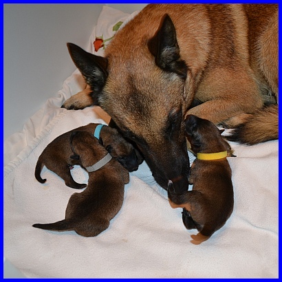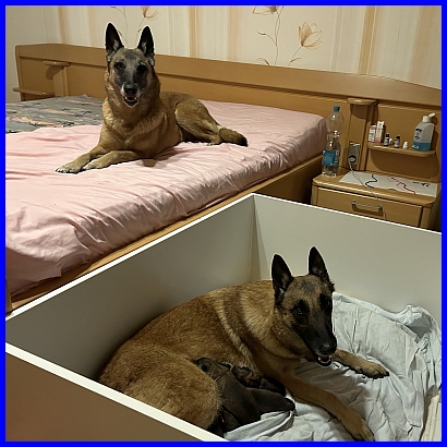 0.02 Uhr war der erste Rüde geboren, und sofort habe ich den Knirps in die Wurfkiste gebracht. Natürlich ist die frischgebackene Mama mitgegangen :-) Aber ihr Blick zu Akela... Sooo stolz schaut sie ihre Mama an!