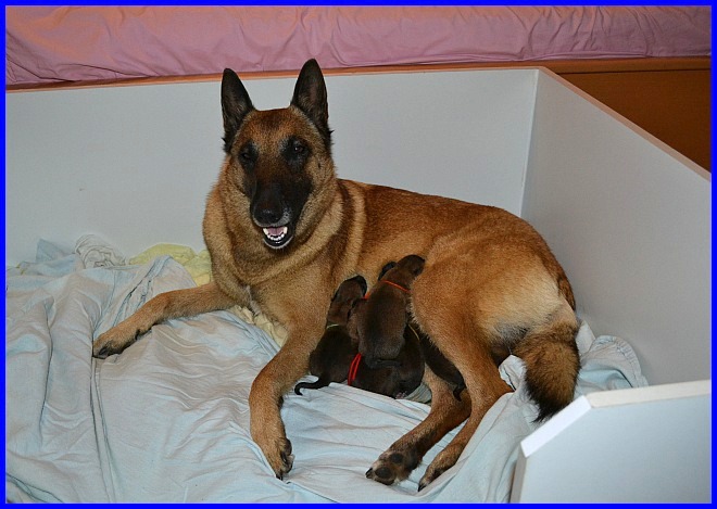 Sie wusste genau das die Geburt in den nächsten Stunden sein würde. Während ich immer noch dachte, es sind sicherlich Senkwehen und die junge unerfahrene Hündin deutet das nicht richtig, das dauert noch paar Tage. Es war ja auch wirklich zeitig, der 58. Tag!!!