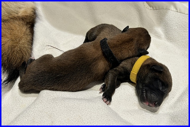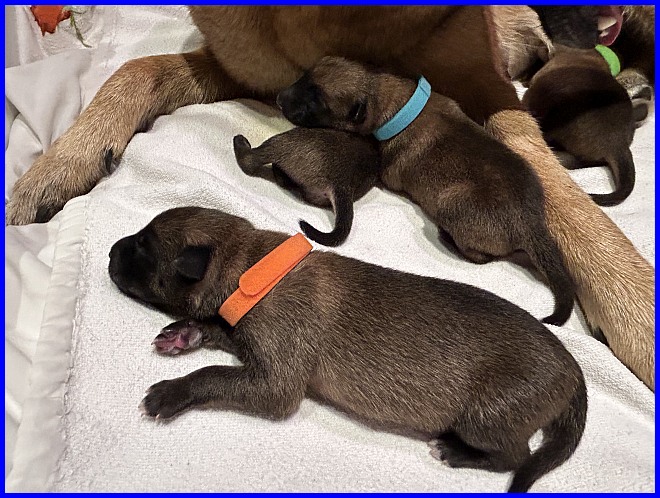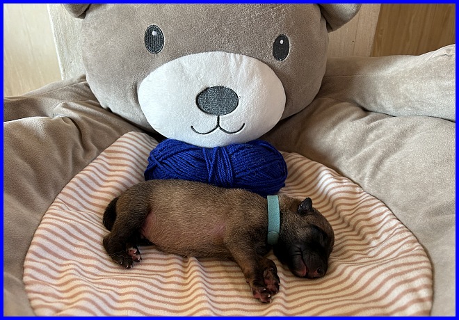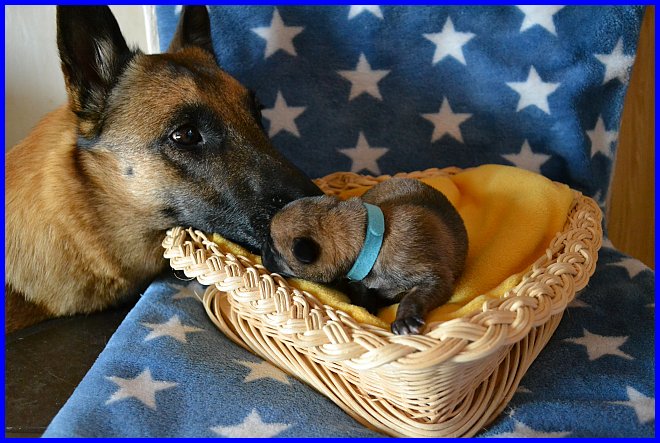Der Erstgeborene Rüde hat ein blaues Halsband bekommen.