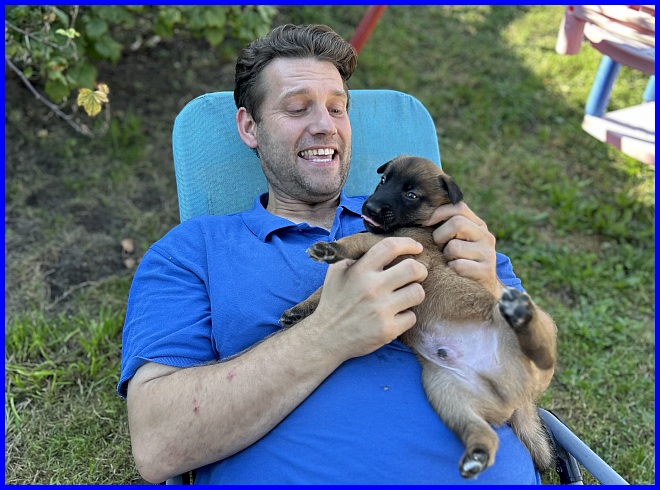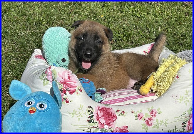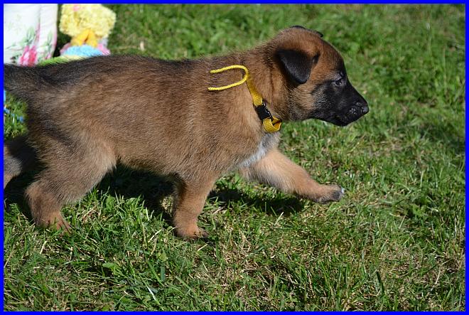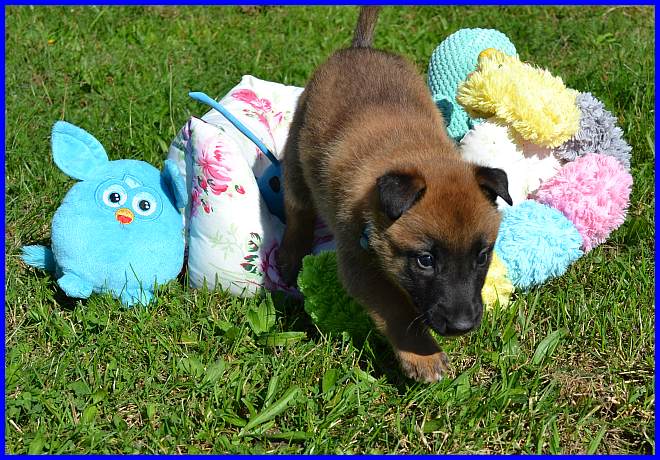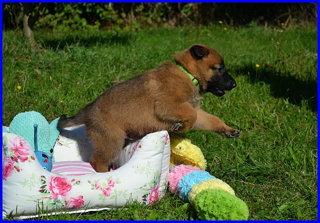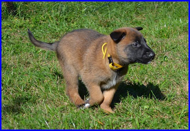 Mr. Gelb ist genauso lieb wie seine Brüder, erkundet gerne alles Neue. Der große Garten war schon verlockend... Er wiegt 2810g und ist damit der schwerste Welpe. |