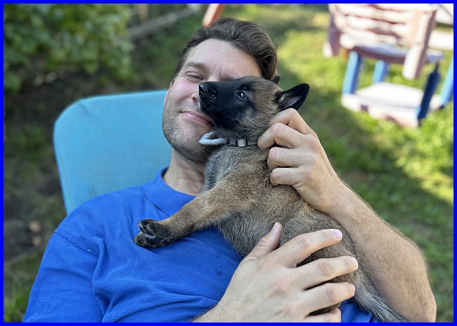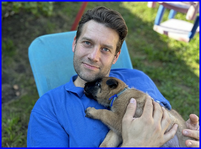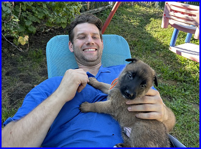 Mr. Schwarz ist, wie alle Welpen, sehr lieb, verschmust, neugierig und offen für alles Neue. Es war schon sehr interessant zu sehen, dass alle Welpen den großen Garten sofort erobern wollten. Er wiegt genau so viel wie sein Bruder Blau, 2560g. |
