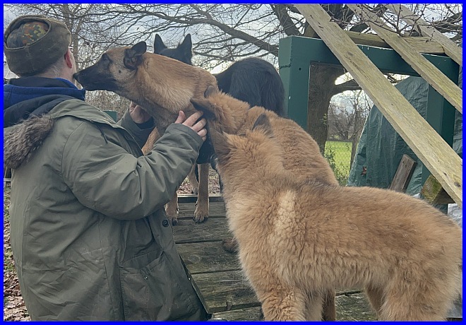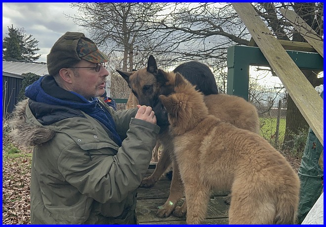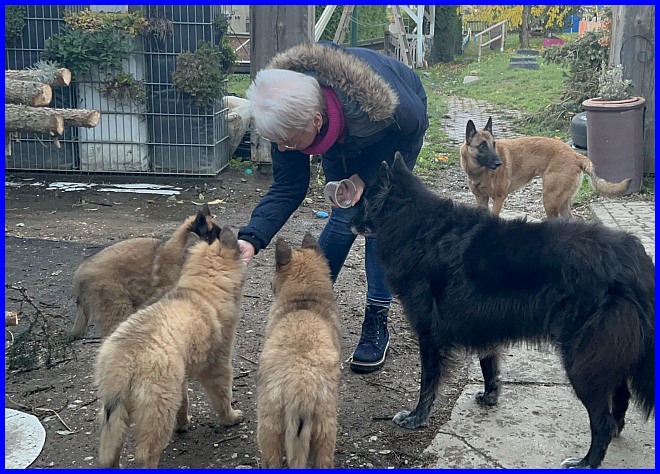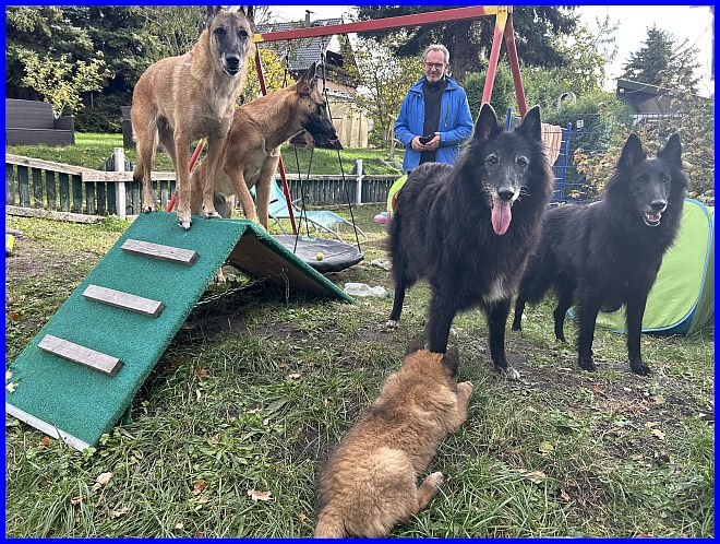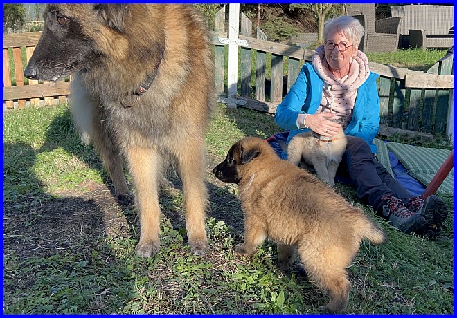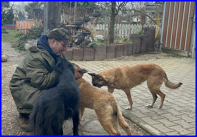 Und Tiffany hat es nicht nur geduldet, dass Michael sie sanft streichelte, sie hat es genossen! Da war mir klar, ich muss meine süße Maus gehen lassen. Das war das perfekte Zuhause, ein einfühlsames Herrchen mit jahrelanger Belgier Erfahrung, ein kleines Hunderudel - zuhause warteten die 14 Jahre alte und noch sehr fitte Gröni Hündin Cheyenne und der 9 Monate alte Tervueren Rüde Baru - und eine liebe Mama, die sich mit freut, denn durch Tiffany wurde das Rudel wieder komplett.