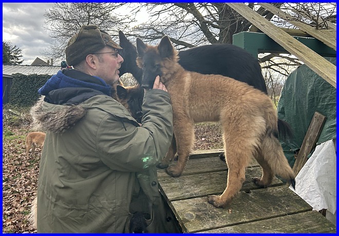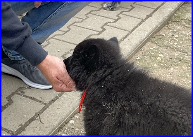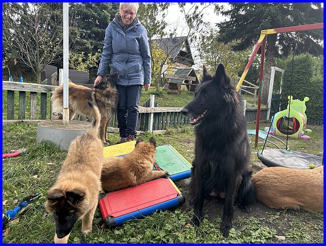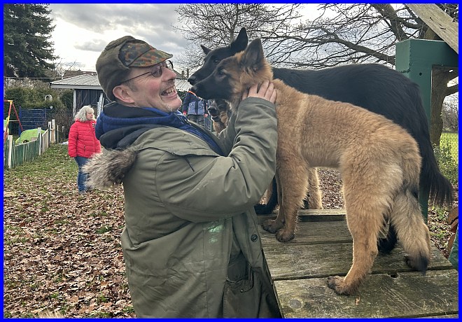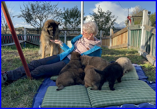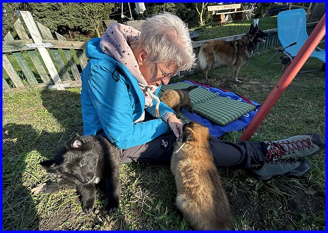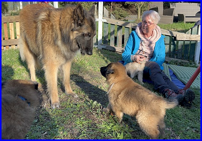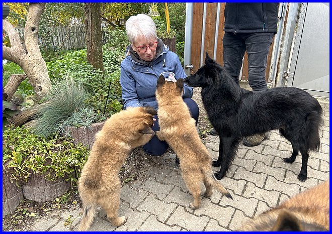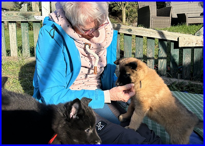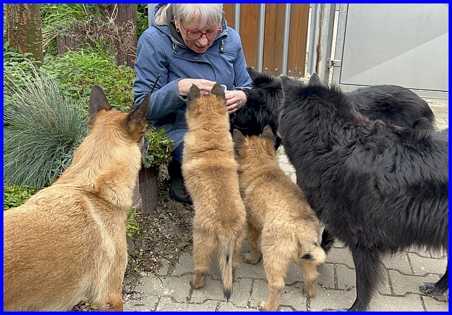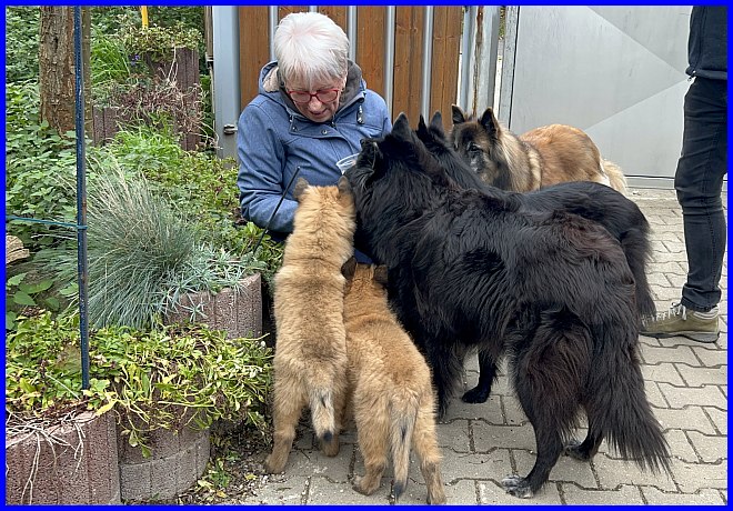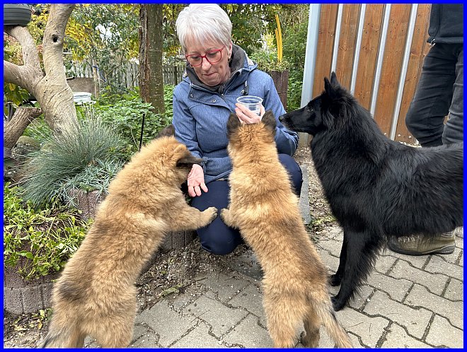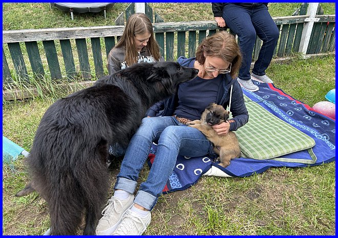Es war schon sehr erstaunlich, beide Rüden waren die ganze Zeit bei Susanne, die Mädels hatten sich verdrückt. Nachdem ich alle Fotos angesehen hatte, war ich selber überrascht, wie sehr sich beide Welpen an Susanne orientiert hatten, sie regelrecht belagert haben, und das nicht nur wegen der Leckerli, die waren ja auch mal alle! |