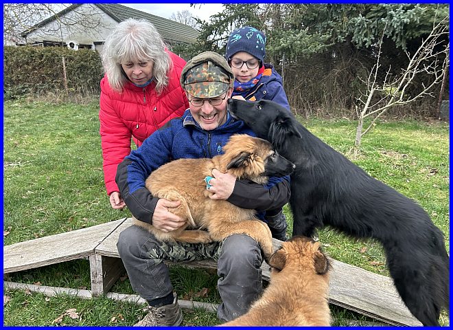 Die Vier - Thomas, Andrea, Ina und Corinna - sind befreundet und waren zusammen bei mir zum Welpen gucken. Während Thomas mit "seiner" Tamina kuschelte, haben Ina und Corinna alle Mädels verwöhnt, jede hätte "Ihre" werden können.