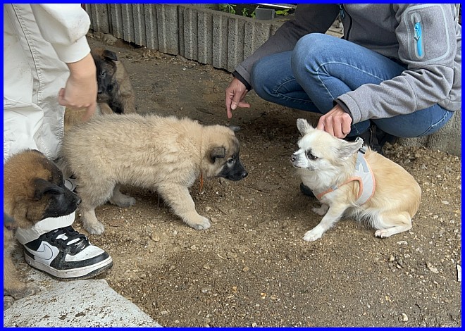 Beim Spaziergang über unsere Wiese hinterm Haus hielt sich Tiara sehr zurück, aber Tiffany war mutig und neugierig und natürlich auch verfressen :-) Da wusste ich, ich werde/muss mich von Tiffany trennen, es passt einfach perfekt, die Chemie stimmt! Oma YooPee hat sich natürlich auch Leckerlis abgeholt, sie ist jetzt 13 Jahre alt und wirklich die Oma der Welpen. Sie ist die Mutter von Viktoria.