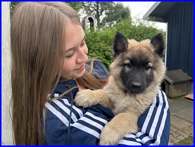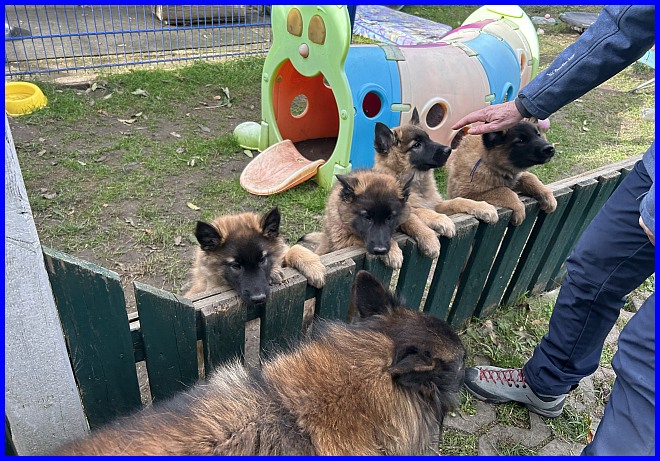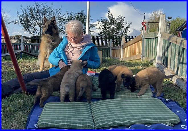 Unser Kennen Lernen war am 07.10.2023, da wusste ich ganz schnell, eine Hündin darf zu Euch ziehen. Nur welche der Hündinnen zu Euch ziehen wird, die Entscheidung dauerte noch ein paar Wochen. Aber das lag nur an mir, da ich ja eine Hündin behalten wollte, und im Alter von 4,5 Wochen kann man keinen Welpen aussuchen.