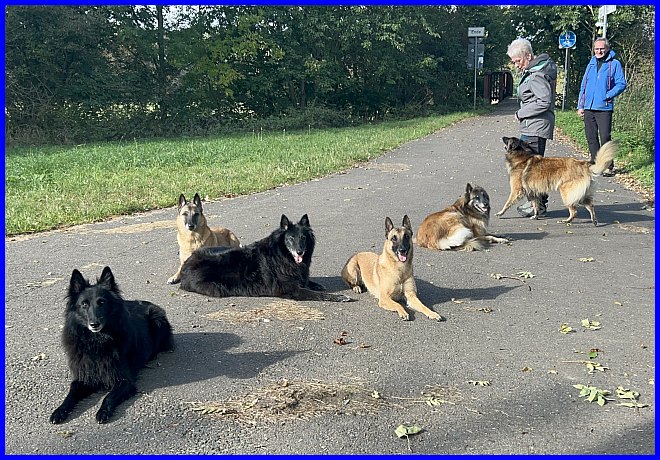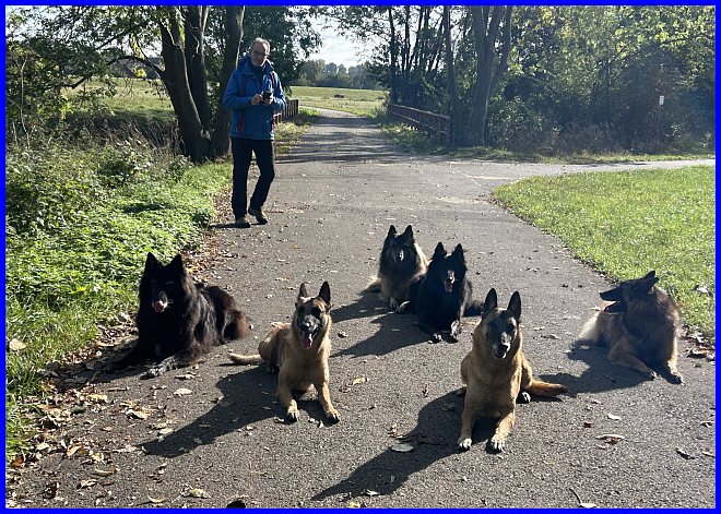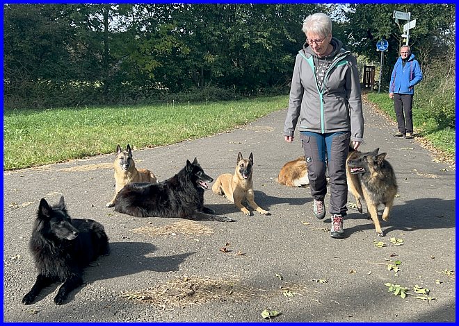 Am nächsten Tag haben wir zuerst einen wunderschönen Spaziergang gemacht, klar wird da immer ein bisschen trainiert. Meine Mädels schauen zu mir und Lady Farouche schaut zu ihrem Herrchen, Heinz-Dieter!