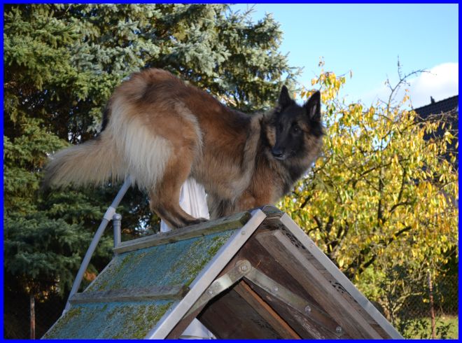 Und Lady Farouche nutzte derweil alle Geräte in unserem Garten, düste durch die Tunnel, lief über die Hängebrücke, hier ist sie auf der Steilwand, eine tolle Hündin!