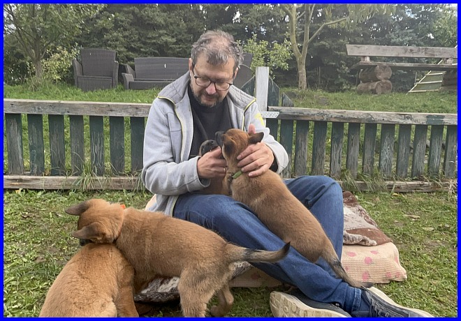 Der kleine Rüde Gelb war sehr an Michael interessiert, und er hat sich sofort in den kleinen Schatz verliebt. Vier Wochen später hat Rüde Gelb den schönen Namen Uranos bekommen und ist nach Berlin gezogen :-)