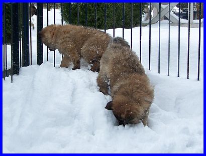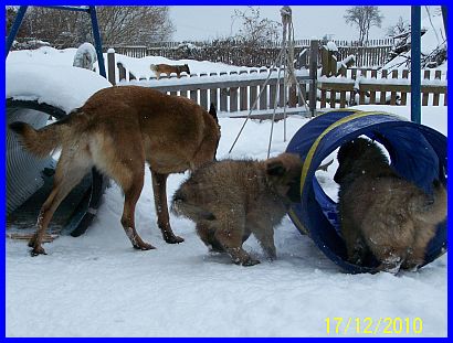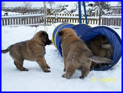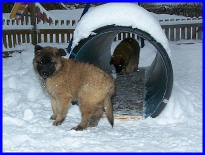 Die letzten zwei Wochen sind wie im Flug vergangen! Die Welpen sind noch schneller gewachsen, haben ein enormes Selbstbewußtsein entwickelt und finden das Herumtollen im Schnee einfach nur klasse. Jetzt dürfen sie auch zeitweise in den großen Garten, das ist natürlich Abenteuer pur. Da gibt es unwahrscheinlich viel zu entdecken. Besonders toll finden sie natürlich die vielen Verstecke, ob es nun die Höhle unter den Koniferen ist oder hinter einem riesen Haufen Schnee, die Möglichkeiten sind nahezu unbegrenzt, wenn man so klein ist;-)
