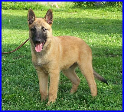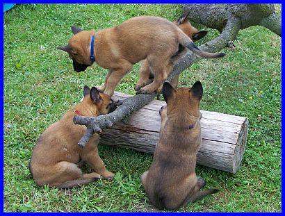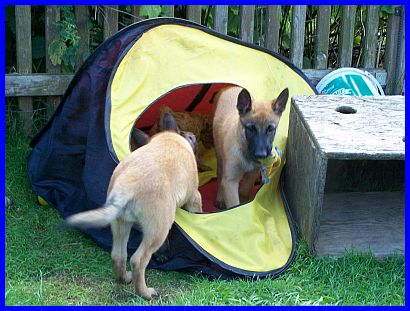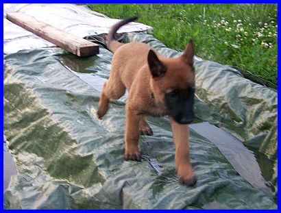 Auf den nachfolgenden Fotos sehen sie Einar, den Einzelkämpfer! Einar ist ein lebhafter, sehr sportlicher junger Rüde. Er ist neugierig und für jede Art von Sport und Spiel zu begeistern. Unerschrocken hat er jedes neue Spielzeug erkundet und erobert. Auf der Schaukel zu stehen, sich von den anderen Welpen drehen und schaukeln zu lassen, macht Einar besonders viel Spaß. Dabei hat er ein ernorm gutes Körpergefühl entwickelt. Einar, wie auch El Bundy, sind sehr liebe, freundliche und gut sozialisierte junge Malinois. Durch unser großes Hunderudel kennen sie schon Junghunde, meine fünf Monate alte Grönihündin Yoopee und den sieben Monate alten Kleinpudelrüden Edward meiner Tochter, erwachsene Belgier und Pudel, und aber auch schon Kleinpudelwelpen. Da meine Tochter zur Zeit einen Wurf Kleinpudel hat, haben die Malinoiswelpen gelernt, wie man mit kleinen Welpen spielt, ohne diesen weh zu tun. Sie passen perfekt als Zweithunde zu Familien auch mit kleineren Hunden. Generell wünsche ich mir für beide eine Familie, die schon einen Hund hat, da sich beide durch unser großes Rudel (insgesamt vier Belgier und fünf Pudel) hervorragend in ein neues Rudel einfügen und damit auch bestimmt sehr glücklich werden würden. Als Einzelhunde hätten sie es in der Anfangszeit sicherlich etwas schwer, aber auch daran gewöhnt sich ein junger Hund sehr schnell. Auf jeden Fall würden sie es sicher sehr genießen, plötzlich "der Mittelpunkt" der neuen Familie zu sein.