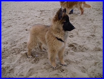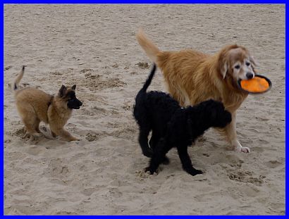 Hier bin ich mit Shadow und Akeera, meine Riesenschnauzerschwester, am Strand. Shadow zeigt uns wie man Frisbee spielt, er ist ein super Lehrer und hat ganz viel Geduld mit uns. |