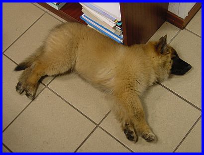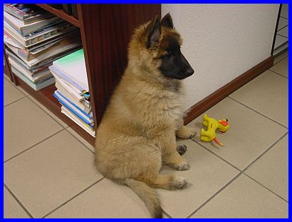 Hallo Mama und alle anderen, die zu Hause an mich denken. Ich bin´s, euer Damon! Mir geht es prima! Ich habe ein ganz tolles Zuhause bekommen, und natürlich schicke ich Euch gleich mal ein paar Fotos. Ich habe auch einen neuen Namen bekommen, ich heiße jetzt "Hasso", so wie mein Vorgänger! Das war ein richtiger Deutscher Schäferhund, bestimmt werde ich auch mal so groß wie mein Namensvetter! Wie ihr seht, auch ich habe zuerst mein ganzes Spielzeug ausgepackt und ordentlich weggeräumt. Am liebsten liege ich bei meinem neuen Herrchen unter dem Schreibtisch, da kann ich alles prima beobachten.