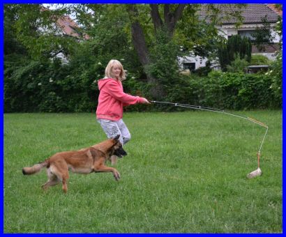 Vitos Lieblingsspielzeug ist zur Zeit die "Reizangel", da gibt er alles, jagt voller Power hinterher! Wenn er sie hat, gibts ein Leckerli, das wollten meine Damen natürlich auch haben, schon wurde Moni von allen Seiten belagert ;-)) |
