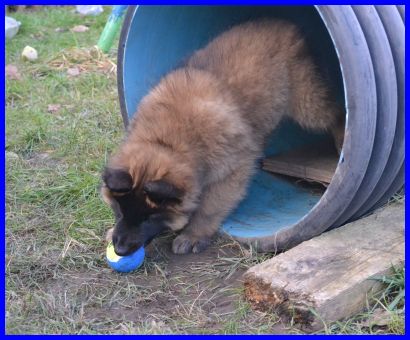 Schon wieder neues Spielzeug im Welpengarten, einfache Plasteflaschen die sich im Wind bewegen und eigenartige Geräusche von sich geben. Plötzlich hängt da was rum, das da eigentlich gar nicht hingehört. Mit den einfachsten Sachen erzielt man Rieseneffekte. Mut, Ausdauer und Geschicklichkeit waren gefragt, um die Flaschen da wieder zu entfernen. Abigail hat als liebe Mama den Welpen gezeigt, das sie vor diesen wackelnden Ungetümen keine Angst haben brauchen. |