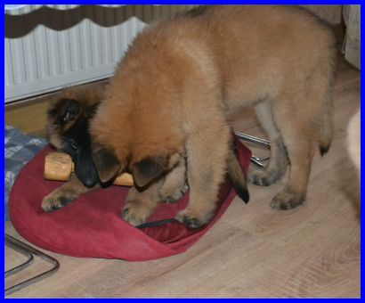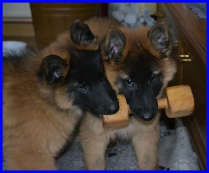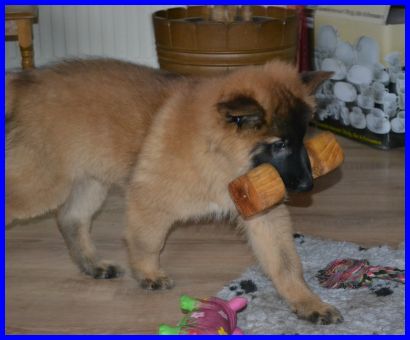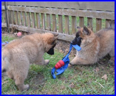 Hier sind Frodo und Falko inzwischen neun Wochen alt. Sie haben Yoopee das Bringholz geklaut und wollten es dann jeder für sich alleine haben. Falko war dann am Ende der Sieger, voller Stolz hat er sein Bringholz in Sicherheit gebracht! |