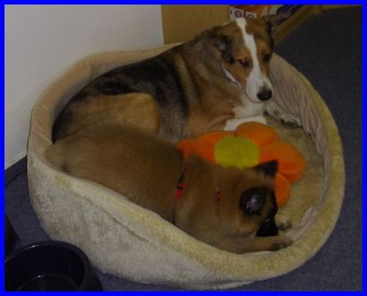 Hier bin ich schon 9 Wochen alt, habe gerade wieder einen neuen Kumpel kennen gelernt, und weil ich eine Nette bin, habe ich mein Körbchen mit ihm geteilt :-))