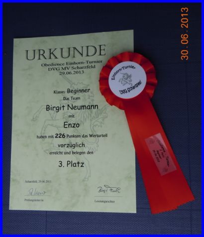 Enzo hat am 29.06.2013 die Beginner im Obedience mit Vorzüglich bestanden, und startet mittlerweile nun schon in der Klasse 2! Weiter so, ihr Zwei seid ein super Team, Birgit!