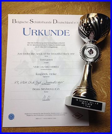 Die Speziale des BSD in Magdeburg war wieder ein mega Erfolg für meine kleine Anuk! Das dritte Mal in der Jugendklasse ausgestellt, hat Anuk V1, Anw. Dt. Jug. Ch. VDH und den Titel Jugendsieger erhalten! Herzlichen Glückwunsch, Heike und Anuk, zu diesem tollen Ergebnis!!