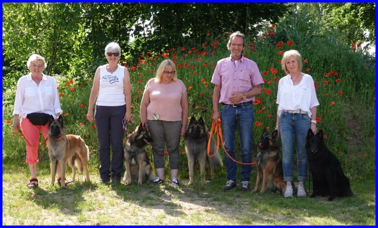Hier ist das Gruppenbild mit allen Lichtleins. Von rechts nach links: Marion mit Leila; Moni, Ernst und Oliver mit Leroy; Moni und Ulli mit Lizzy; Susanne mit Lady Farouche und ihrer Groenendael Hündin Kessy.