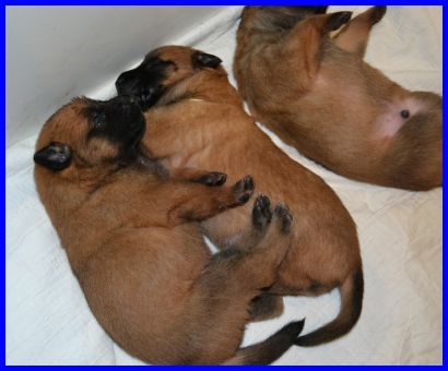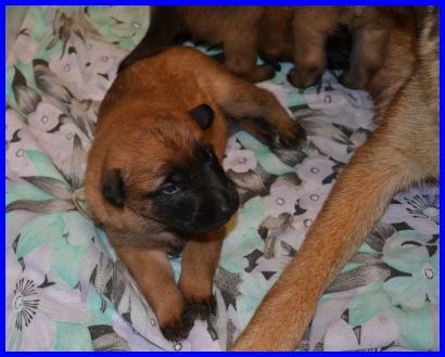 Nach soviel Aufregung war der Hunger riesengroß, und Avanti schläft dabei ein. Mittlerweile wiegen die Welpen zwischen 1800g und 2000g. Sie nehmen sehr gut zu und können sich zu ihrem große Bedauern nun nicht mehr zwischen Avantis Beinen verstecken! |