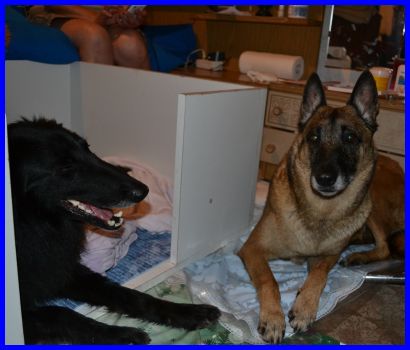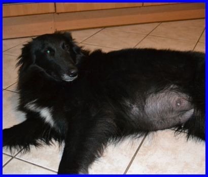Eine Stunde vor der Geburt des ersten Welpen. Die Wurfkiste fand sie nicht so toll, lieber wäre sie in meiner Küche hinter der Eckbank gewesen oder auf dem Sofa in der Stube. |