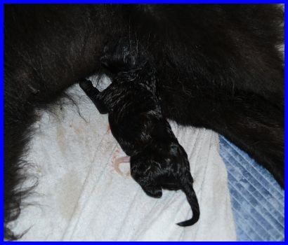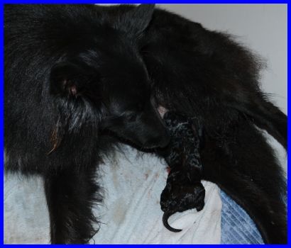 Der erste Welpe, ein kräftige Hündin, ist geboren. |