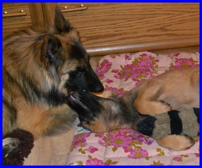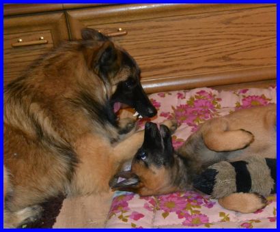 Mit Farouche, meiner 16 Monate alten Tervuerenhündin, spielt Gino am liebsten. Sie hat genauso viel Unfug im Kopf wie er :-)) |