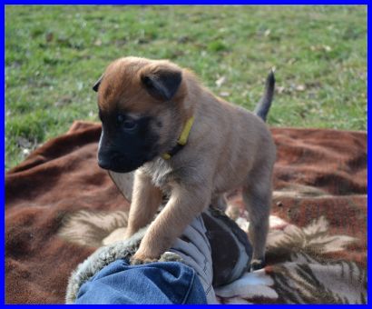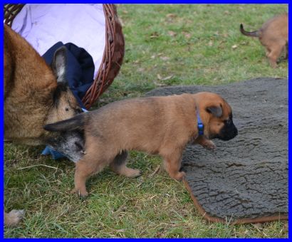 Auf den nachfolgenden Fotos sind die Babys schon vier Wochen alt! Aus den kleinen Kuschelbabys sind mittlerweile richtige Riesenbabys geworden! Sie wachsen und gedeihen prächtig! Sie sehen nicht nur aus wie richtige Hunde, sie verhalten sich auch so. Sie bellen und knurren wie die Großen, verteidigen erobertes Spielzeug, kämpfen um die beste Zapfstelle bei Mama oder den beliebtesten Schlafplatz. Alles neue wird sofort untersucht und nach Möglichkeit in Sicherheit gebracht. Da wir für die Jahreszeit sehr schönes Wetter haben, kein Regen- bzw. Matschwetter, durften die Knirpse seit dem 09.02.2014 jeden Tag in den Garten. Sie genießen die neugewonnene Freiheit in vollen Zügen, auch Vanessa war wieder da und wurde von allen Seiten belagert und gründlich untersucht.