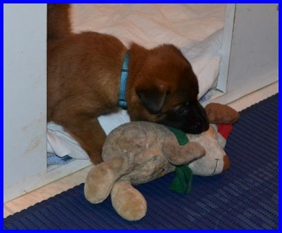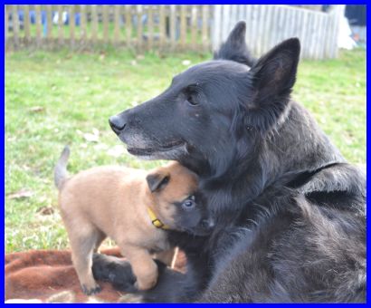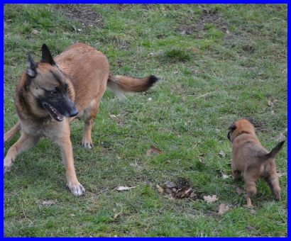 Hier fordert Avanti den Rüden grün zum spielen auf. Man kann sehr gut sehen, wie sich Avanti um den Kleinen bemüht, mit ihm kämpft und ihn dann gewinnen lässt. |