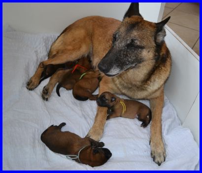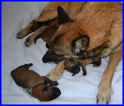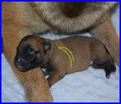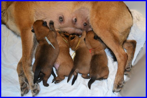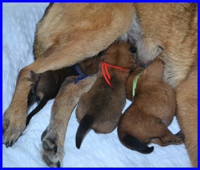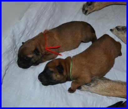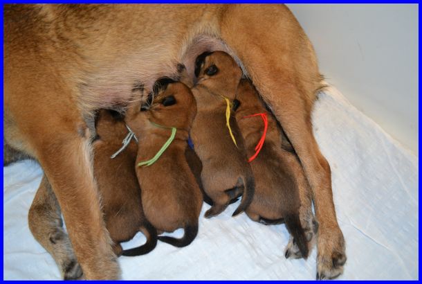 Zwei Tage später, am 04.09.2015, sind die Welpen sechs Tage alt. Die Rüden mit dem blauen, gelben und grünen Band hatten an dem Tag ihr Geburtsgewicht schon verdoppelt!!!