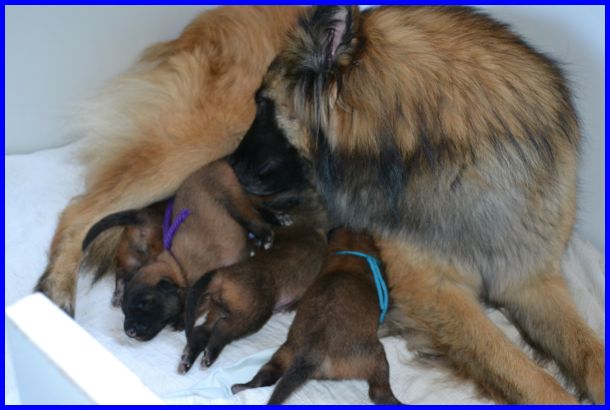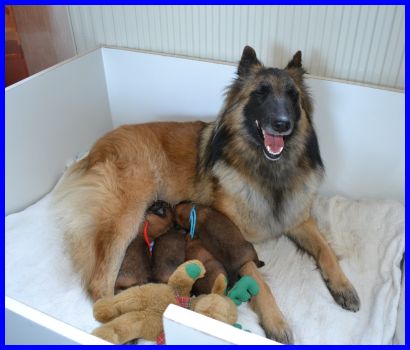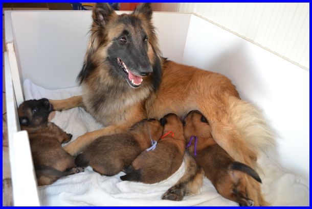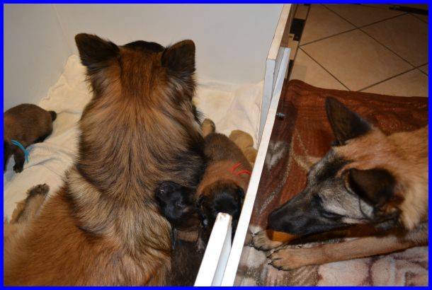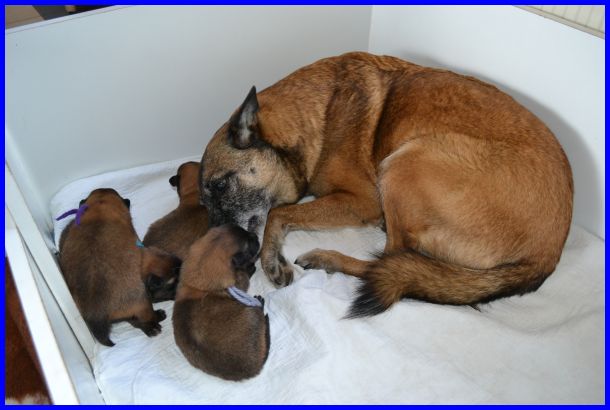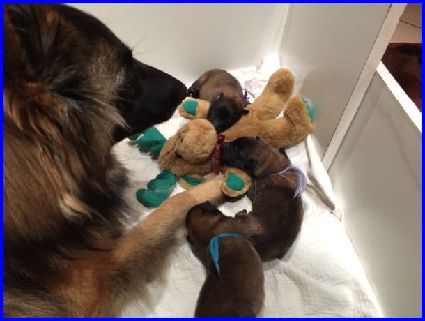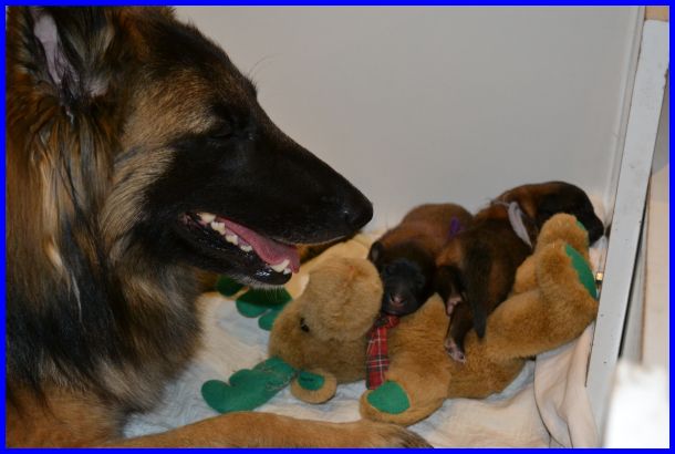 Ich habe Avanti heimlich mal kurz zu den Babys gelassen, Farouche war im Garten! Avanti war so glücklich, hat sich gleich dazu gelegt und die Babys geputzt. Die Welpen sind hier neun Tage alt.