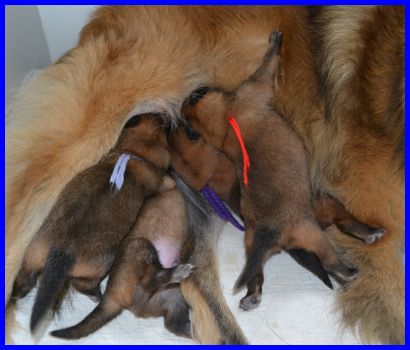 Die ersten Fotos sind vom 14.04.2016 da sind die Welpen erst drei Tage alt! Farouche war der Meinung, ihre Babys brauchen schon ein Plüschtier! Sie hat diesen Weihnachtselch immer wieder zu den Welpen gelegt, so dass ich es dann aufgegeben habe, ihn rauszunehmen!