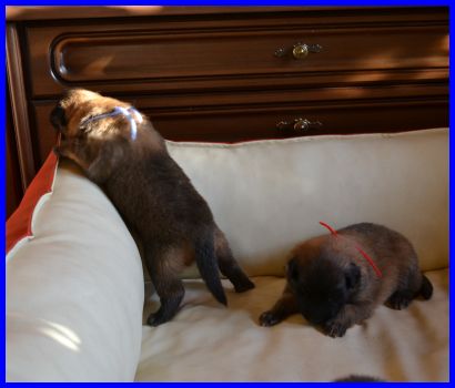14 Tagen, die sie nun schon auf der Welt sind, enorm entwickelt. Aus blinden und tauben Saugwelpen haben sich kleine Hunde entwickelt, die langsam die ersten tapsigen Schritte versuchen. Einen riesen Schritt in der Entwicklung gab es vom 10. bis zum 14. Lebenstag der Welpen. Mit 9 Tagen sind die Welpen noch recht unbeholfen, die Augen und auch die Ohren sind noch geschlossen, die kleine Welt besteht zum größten Teil immer noch aus trinken und schlafen. Schon zwei Tage später versuchen die Babys sich aufzusetzen, auch wenn es nur ganz kurz und ziemlich wakelig ist. Mit 14 Tagen sind bei allen Welpen die Augen geöffnet, sie nehmen eindeutig Schatten wahr, reagieren auf Bewegungen vor ihren Augen. Sie versuchen die ersten richtigen Schritte, fallen natürlich nach zwei bis drei Schritten auf die kleinen Nasen, aber sie versuchen ihr Glück immer wieder aufs Neue! Die Babys untersuchen schon recht neugierig ihre Geschwister, versuchen mit dem kleinen Mäulchen einander festzuhalten. Ab und zu kann man schon kleine Knurrlaute aus der Wurfkiste hören! Sie sind jetzt auch in der Lage sich selbstständig zu lösen.